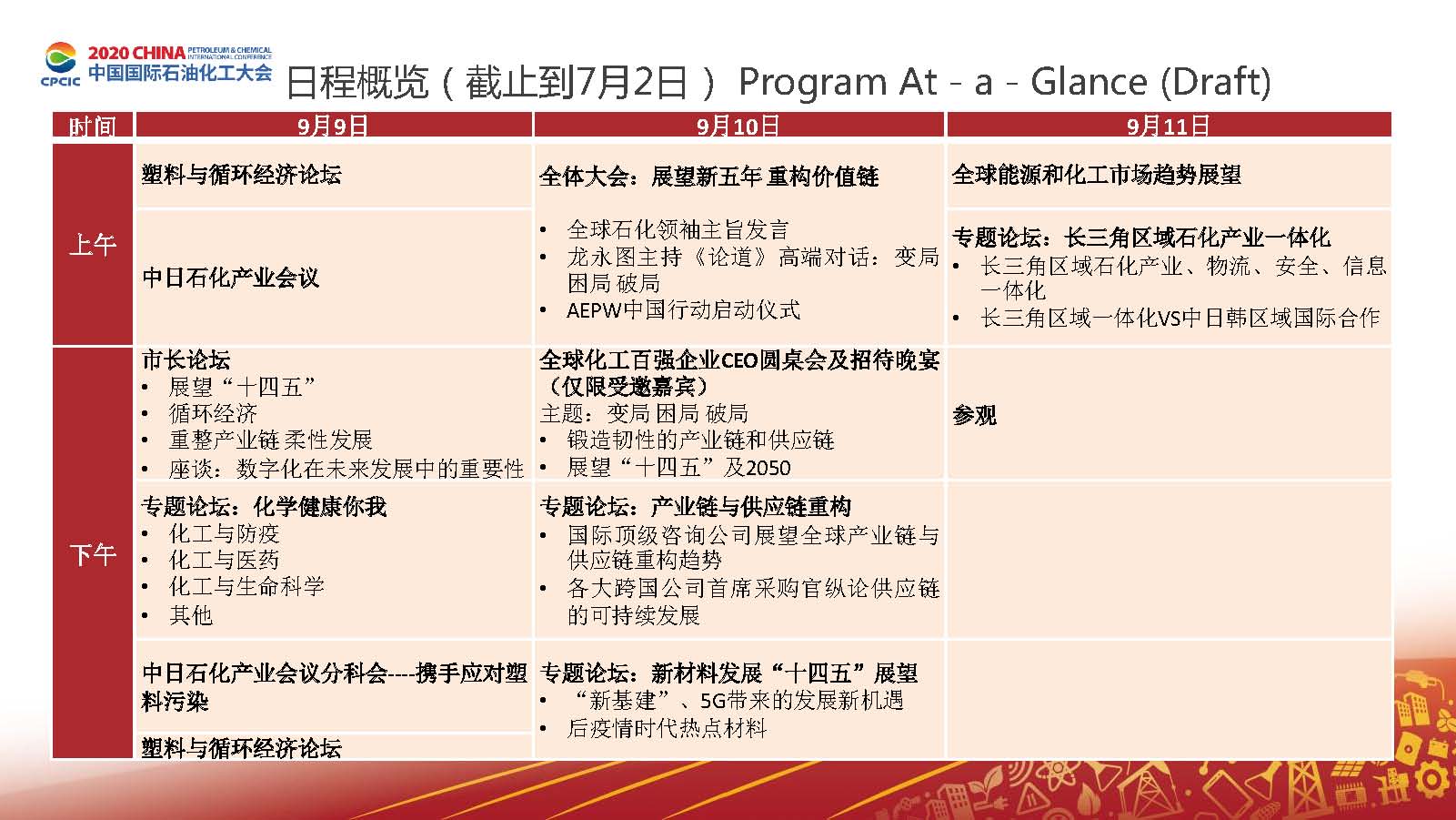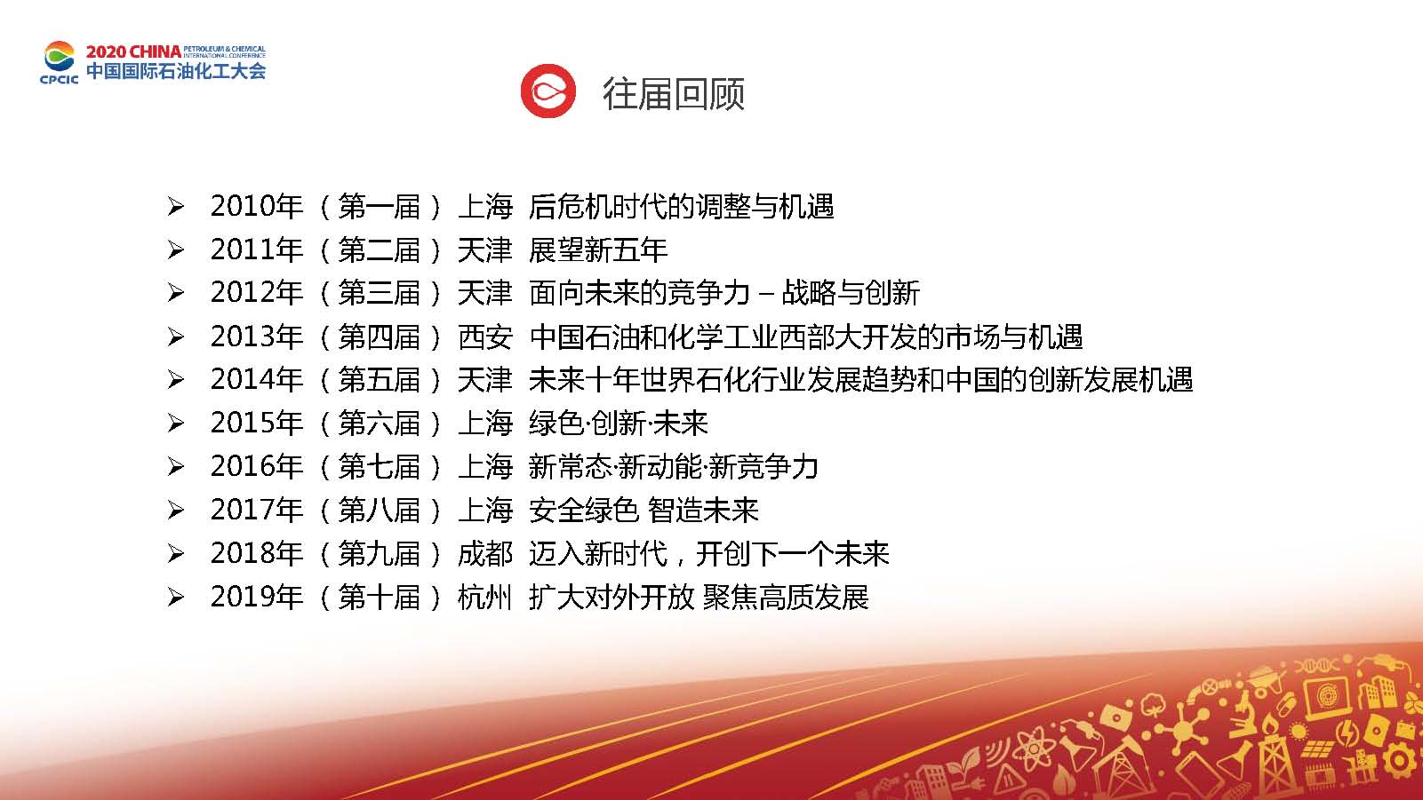 您现在的位置是:首页 > 会议活动网站首页会议活动 2020 中国国际石油化工大会(CPCIC)介绍 管理员 2020-08-19 6087 次阅读 TAG: 无标签 上一篇:Topco与阿里巴巴联手打造第十届中国石油化工装备采购峰会暨展览会(CSSOPE 2020) 下一篇:CSSOPE重磅发言人:伊朗采购团确认演讲并采购石油设备 相关文章 特别推荐 【火爆出炉】CSSOPE 2025 全球采购对接会排期表 阅读 全球氢能项目大汇总,快来点击索要 阅读 随机推荐 捷报!管道局又一重点海外工程投产成功! MOL加入Delfin FLNG项目,最终投资决定有望近期达成 2023-06-12 09:28:10 沙特阿美与东方盛虹签署合作框架协议 2023-09-28 09:29:09 来啦!汉诺威工博会月底开幕,展会将释放什么信号? 2022-05-11 06:45:42 【品牌故事】从山特维克材料科技到Alleima合瑞迈 ——... 2022-11-01 18:58:29 点击排行 《能源石化交易行业区块链应用白皮书》全网联合首发! 意大利塞班( SAIPEM)油气项目及采购计划:CSSOPE 为你解读 2019-03-14 15:21:04 集团公司召开2019年HSSE工作视频会议 2019-01-04 18:12:57 石油党员党建信息化平台交纳党费上亿元 2019-01-11 16:33:49 中国石油2022年集中采购招标公告 2022-02-11 20:43:22 标签 会议 中国石化新闻网 中国石油新闻中心 转载 原创 关注我们