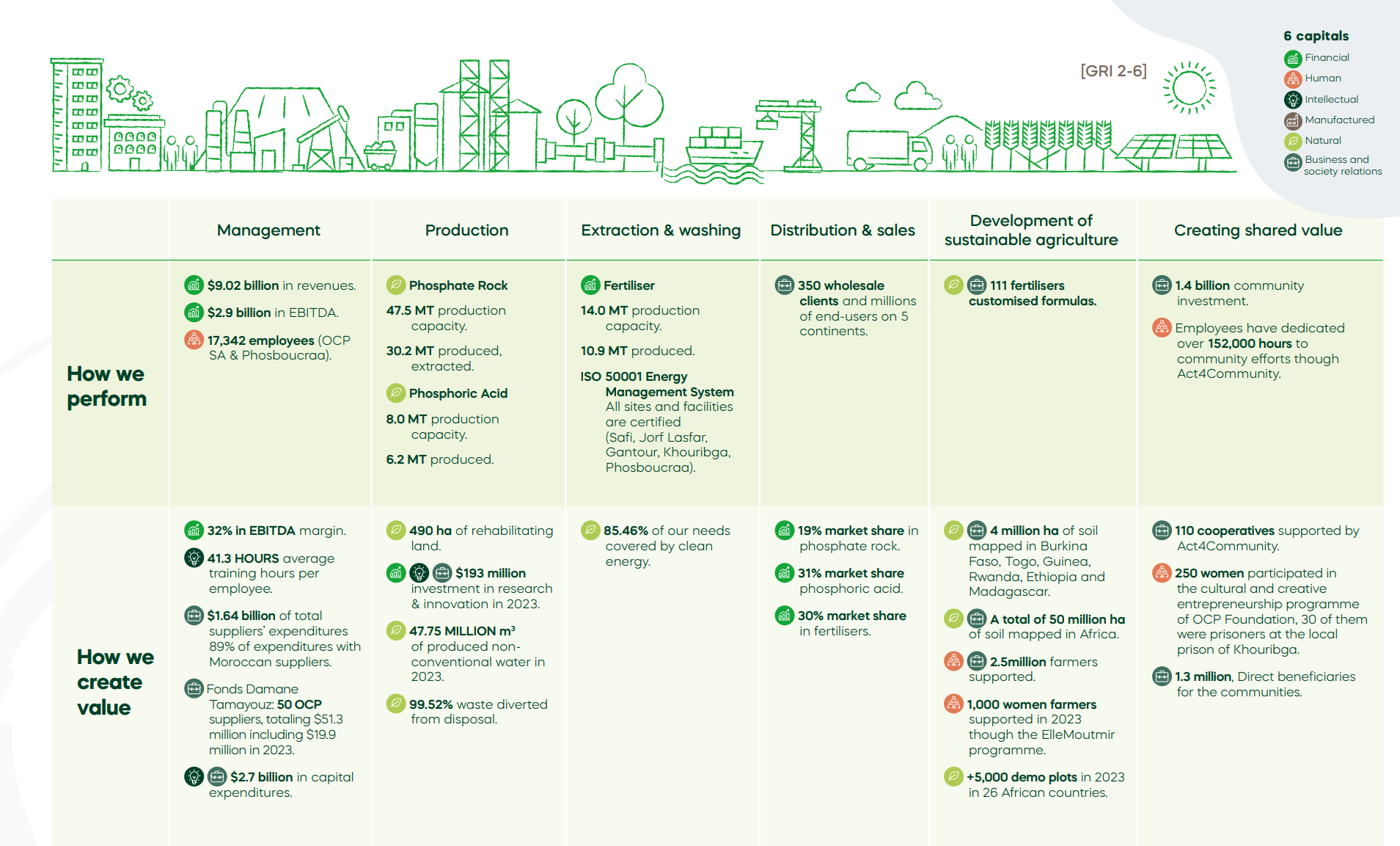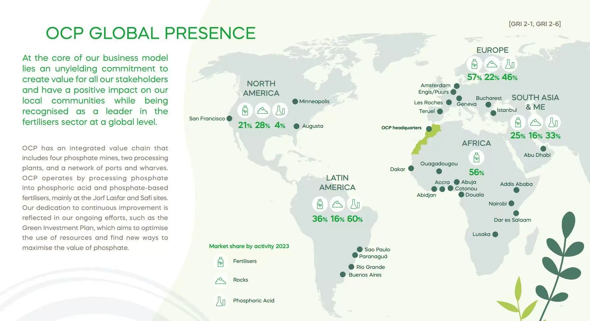 摩洛哥磷酸盐集团是全球领先的磷酸和磷酸衍生物生产企业,也是世界上最大的磷矿和磷酸出口企业之一,在全球磷化工产业中占据了不可替代的地位,其业务涵盖了整个磷酸盐价值链,包括磷酸盐及其衍生品的提取、运输和销售。