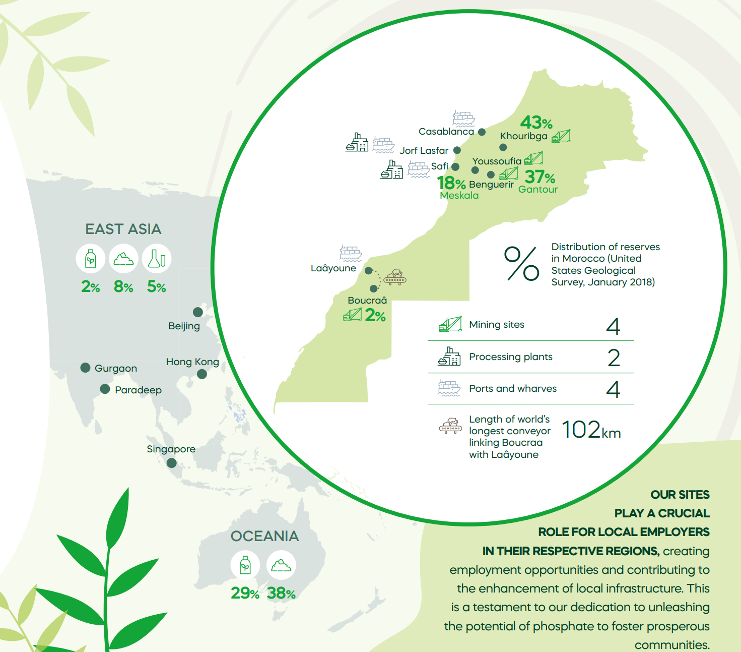 摩洛哥磷酸盐公司(OCP)作为该国磷酸盐资源的唯一总管,已成为世界最大的磷酸盐出口商和生产商,集团业务垄断国内磷化产业链各环节,30家分公司及合资企业分布全球。OCP 在中国北京,及香港设有分支机构。生产4个矿区,2个处理厂,4个港口和码头,且拥有全球最长的磷矿浆管道运输输送系统长达102Km。