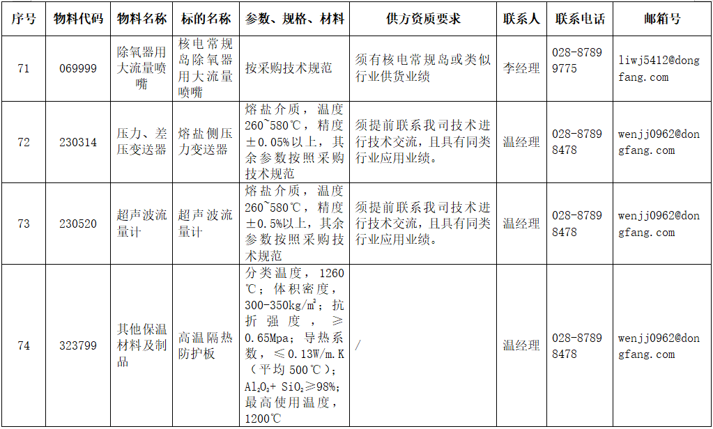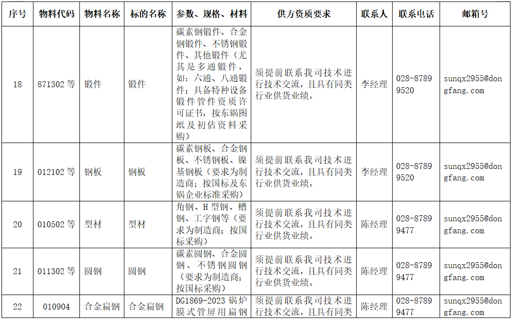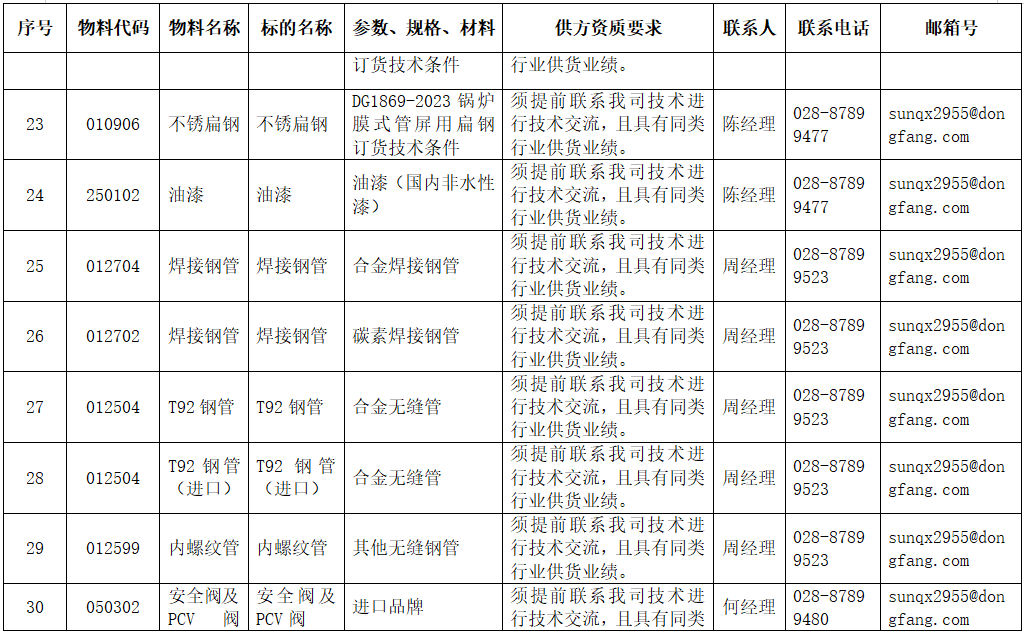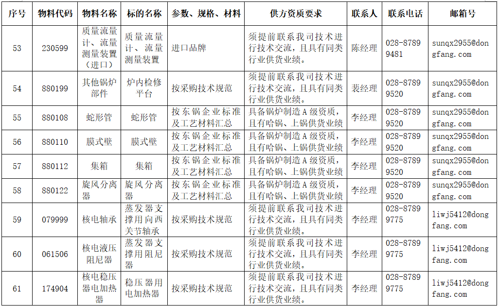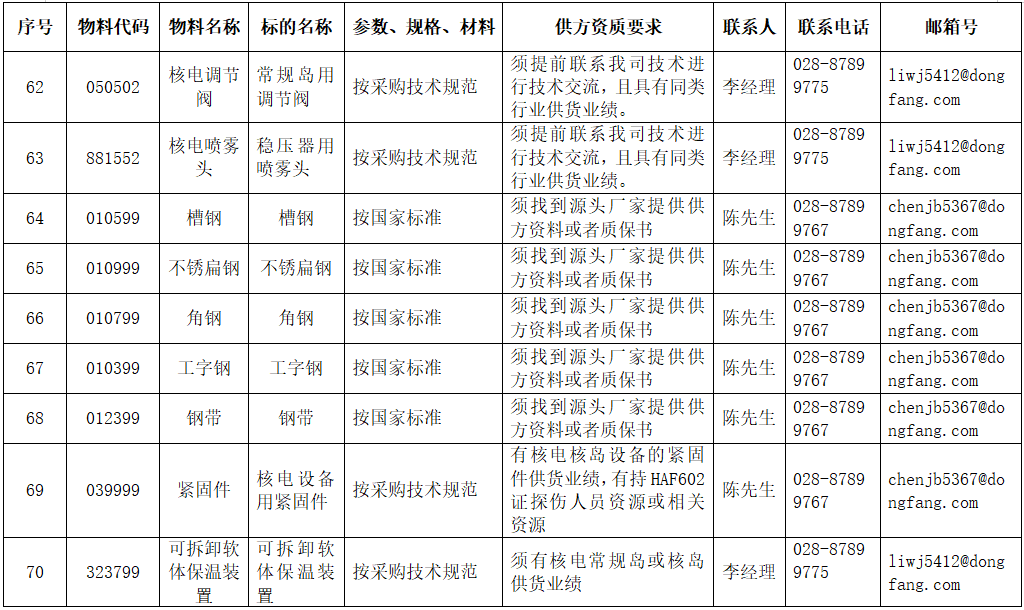 东方电气集团东方锅炉股份有限公司拟在全国范围内对附件清单中的物项进行公开寻源,欢迎有意向和符合条件的供应商积极参与报名。