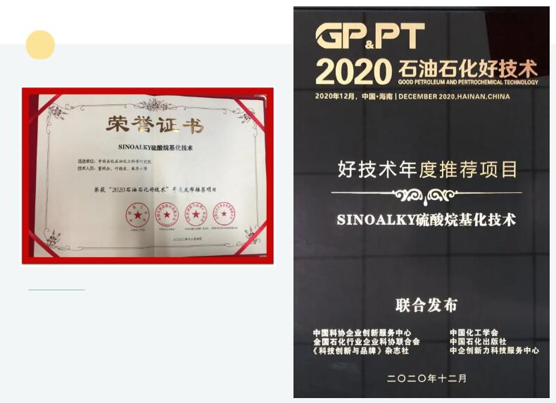2020年,中国化工学会、中国石化出版社、中国科协企业创新服务中心、全国石化行业企业科协联合会等单位将SINOALKY技术评选为“2020石油石化好技术”。评审委员会认为该项技术解决了中国石油石化行业的关键核心技术问题,产生了重大的经济、社会和环境效益,是真正的“好技术”、“绿色技术”。