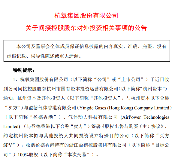 杭氧股份5月4日晚间公告,近日收到公司间接控股股东杭州资本通知,杭州资本于近日和其他投资人及盈德香港、气体动力,签署《股权出售与购买(主)协议》,约定杭州资本拟与其他投资人共同投资设立买方SPV,收购盈德香港持有的目标公司100%股权。