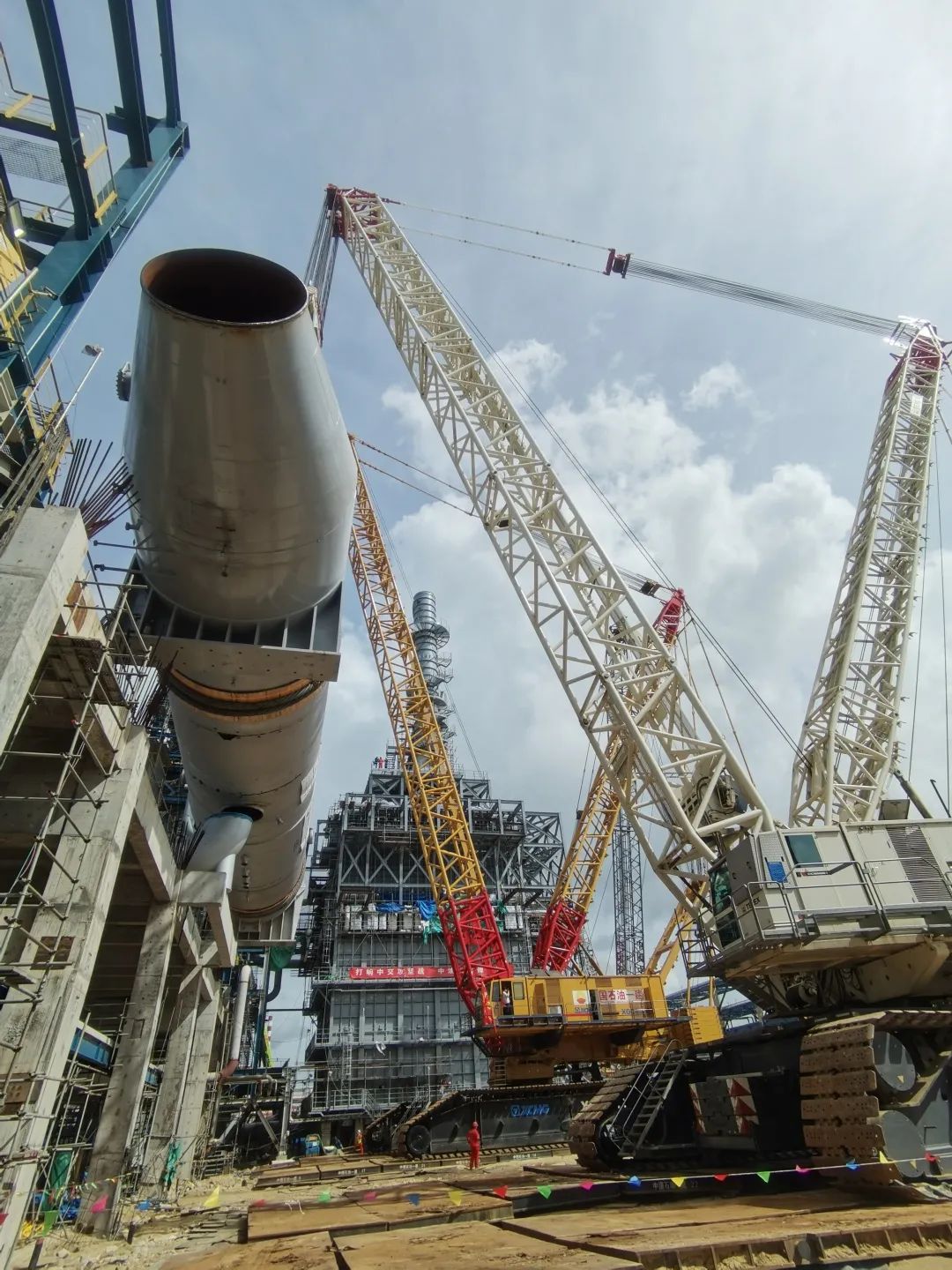 2022年7月16日,天津南港乙烯项目起运公司4000吨级履带式起重机顺利将2#丙烯塔吊装就位,标志着中国石化集团“十四五”期间建设的天津南港高端新材料项目集群迈入全新阶段。2天后,中石油广东石化炼化一体化项目最后一台千吨级设备——苯乙烯装置四联换热器顺利吊装就位,标志着广东石化项目大件设备一体化吊装工程圆满收官。
