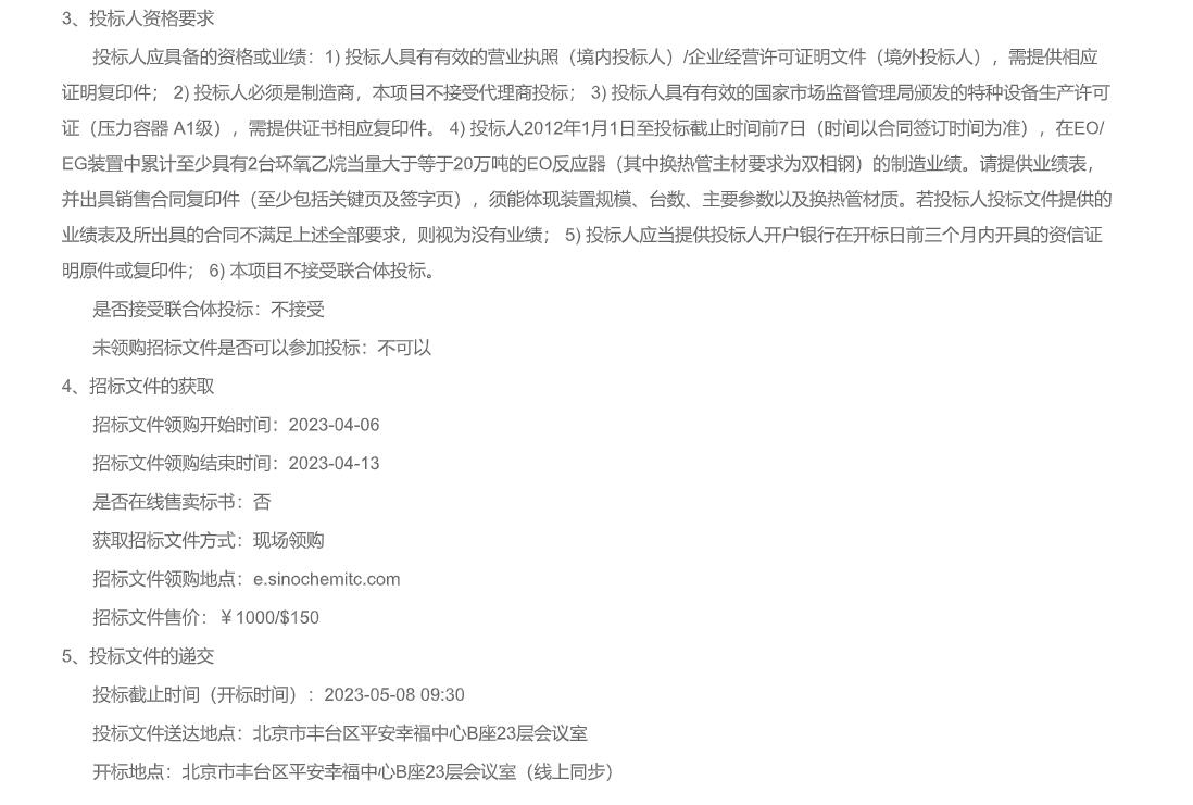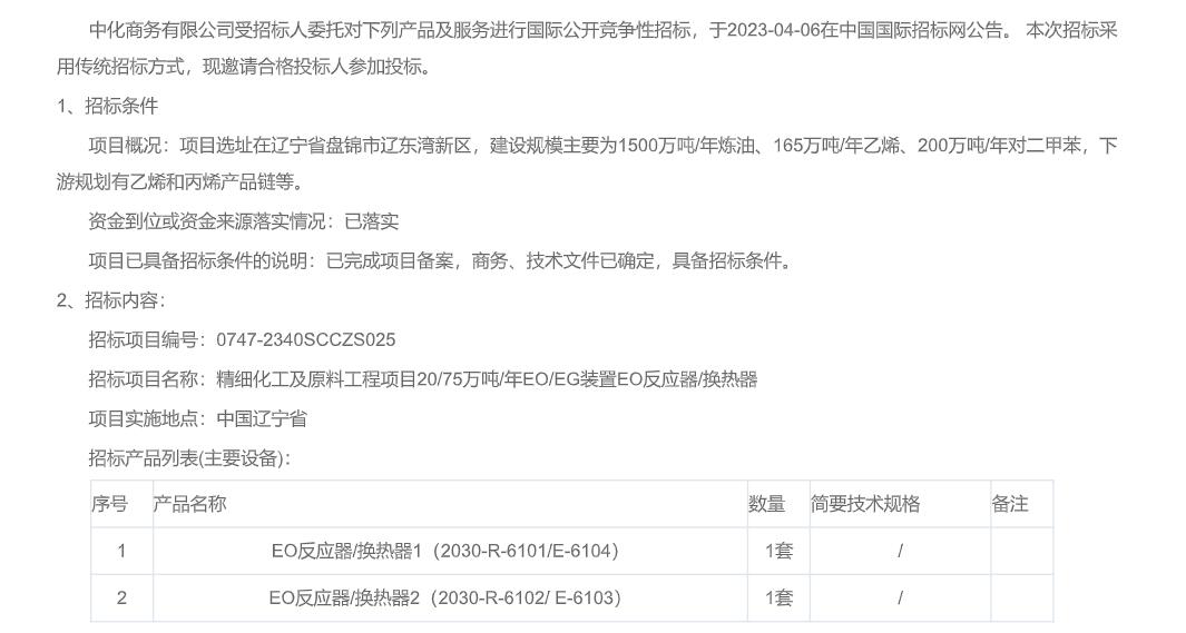 您现在的位置是:首页 > 拟在建项目网站首页拟在建项目 北方华锦联合石化有限公司精细化工及原料工程项目20/75万吨/年EO/EG装置EO反应器/换热器招标公告 管理员 2023-04-10 TAG: 无标签 上一篇:精细化工及原料工程项目渣油加氢、芳烃联合等装置循环氢压缩机;高丙烯催化裂化、延迟焦化装置富气压缩机招标公告 下一篇:精细化工及原料工程项目3X82000标准立方米每小时(02)成套空分装置采购招标公告 相关文章 特别推荐 【火爆出炉】CSSOPE 2025 全球采购对接会排期表 阅读 全球氢能项目大汇总,快来点击索要 阅读 随机推荐 2021年我国机电进出口31256亿美元,同比增长25.5% 两部门:到2023年高效节能电机年产量达到1.7亿千瓦 2021-11-24 10:45:32 阿联酋最大石油公司斥资1500亿美元提产 2022-11-30 09:17:49 延化公司60·80项目开车成功 2024-08-08 10:21:42 华谊钦州化工基地二期项目签约 总投资208亿元 2019-03-08 15:22:39 点击排行 英力士全球超大单套LV PAO在德州巧克力海湾开车 意大利塞班( SAIPEM)油气项目及采购计划:CSSOPE 为你解读 2019-03-14 15:21:04 集团公司召开2019年HSSE工作视频会议 2019-01-04 18:12:57 石油党员党建信息化平台交纳党费上亿元 2019-01-11 16:33:49 中国石油2022年集中采购招标公告 2022-02-11 20:43:22 标签 会议 中国石化新闻网 中国石油新闻中心 转载 原创 关注我们