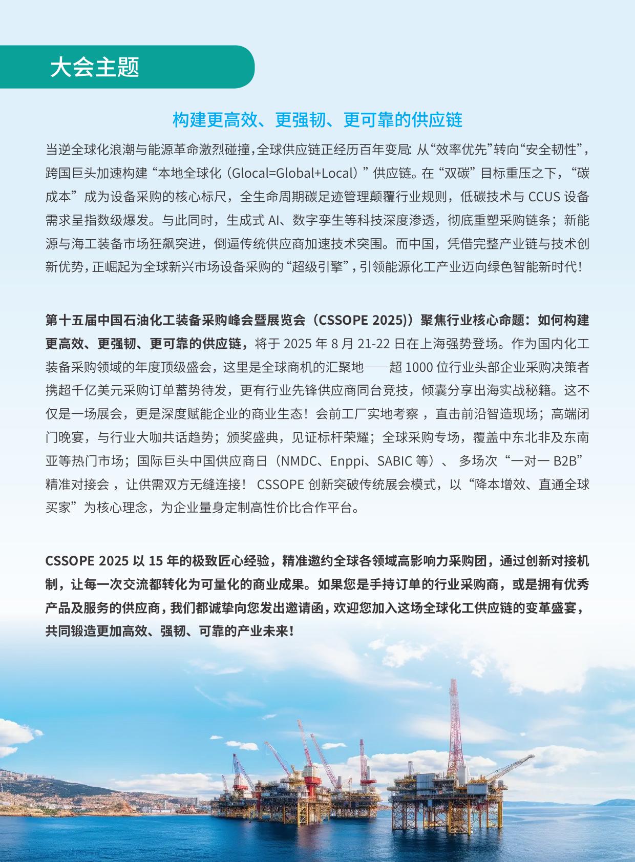 2025年8月21 - 22日,第十五届中国石油化工装备采购国际峰会暨展览会(CSSOPE 2025)将在上海跨国采购中心盛大举办。这不仅是油气化工行业一年一度的采购盛会,更是中国供应商扩大国际“朋友圈”、对接国际买家的黄金契机。