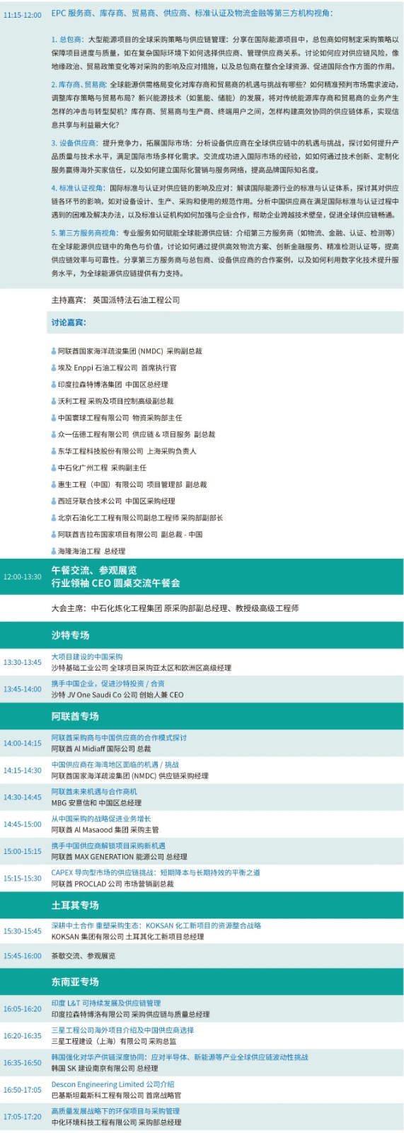 此外,SABIC 全球动设备采购专家陈穗颖将参与 “业主方视角” 专题 panel 讨论,与非洲能源商会、埃尼集团、巴斯夫等全球行业领袖一道,探讨能源转型背景下全球供应链的优化路径,分享 SABIC 在供应商管理、国际合作及数字化采购中的实践经验,助力中国供应商更深度融入全球产业链。