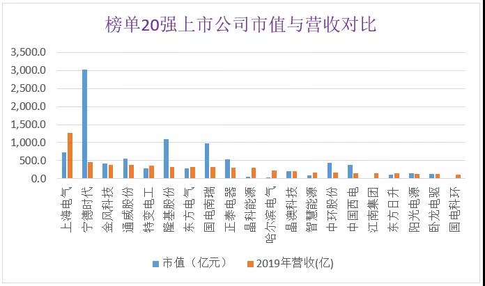 在20强榜单中,民营企业数量占优。上榜企业中,7家为国有企业,它们分别为上海电气、东方电气、国电南瑞、哈尔滨电气、中环股份、中国西电和国电科环,营收总和(2597.28亿元)占20强上市公司营收总和(6038.7亿元)43.01%;榜单中其余13家为民营企业,其营收总和(3441.42亿元)占20强上市公司营收总和(6038.7亿元)的53.99%。