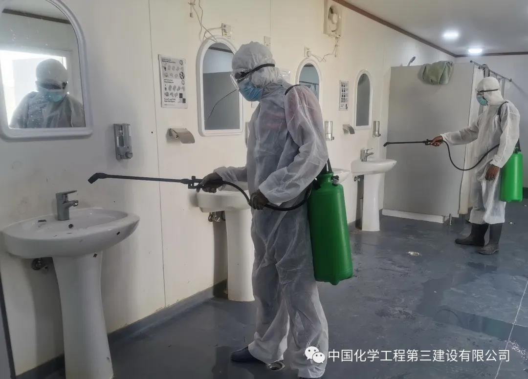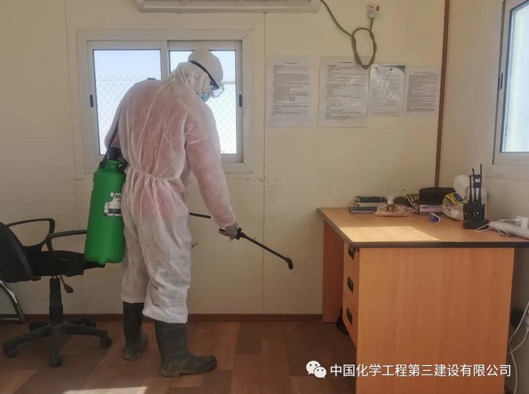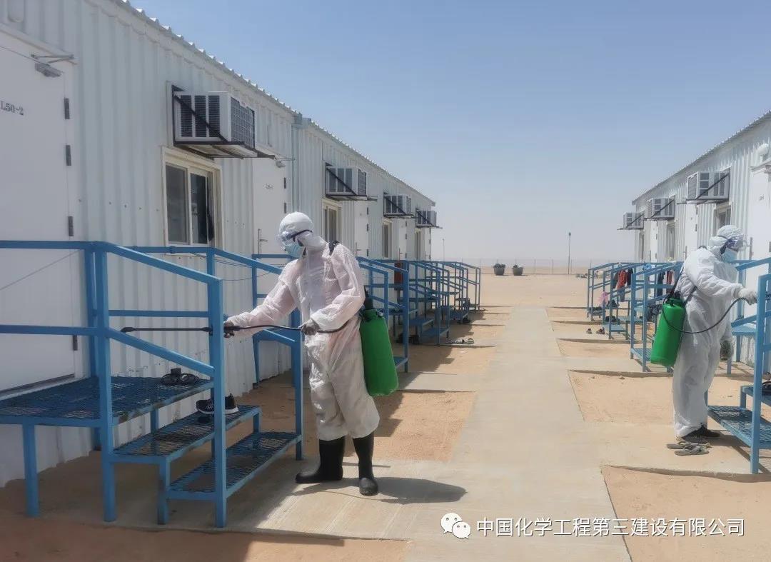 疫情发生以来,沙特哈拉德项目经理部按照集团公司、公司的统一部署,第一时间制定并不断修订完善《项目新冠肺炎疫情防控应急预案》,利用QQ群、微信群、线上教育、张贴宣传画等形式,将防疫知识宣传到全体员工,提高全员防疫意识,确保“一米线”和“戴口罩”人人皆知。同时采用给中外员工发放口罩、每日早晚两次体温测量全覆盖;对主办公室进行封闭管理、错峰乘车、错峰就餐;减少项目人员流动、营地封闭管理、业余时间禁止外出;取消堂食、关闭祈祷室、娱乐室、健身房;对营地超市进行限员入内;对现场办公区、休息棚、厕所、通勤车、营地宿舍、餐厅、公共洗浴间进行每日两次的全面消杀;每日全员在“化学海外”上报身体状况;全体中国员工签订承诺书;严控外籍人员私自外出、流动去大城市等举措,充分把握疫情防控主动权,全力推进项目建设。