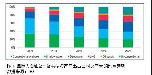 总体上,常规陆上和浅水资产的产量占国际大石油公司油气总产量的比重将持续下降,该比例从2009年的72%降至2019年的52%,IHS预计到2030年,该比例将降至40% 以下(见图1)。资产组合构成上,雪佛龙和埃克森美孚非常规资产占比将超过60%,壳牌和挪威国油的深水资产占比将超过40%,道达尔、壳牌和埃尼的LNG资产将占20%左右(见图2)。