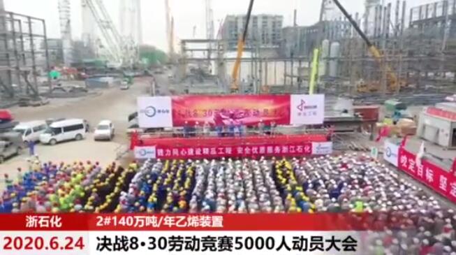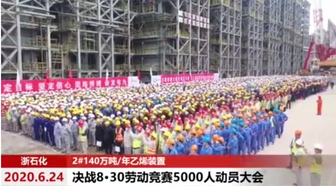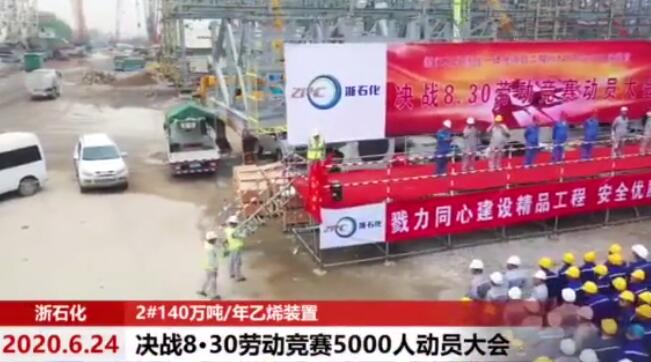 浙石化工程事业部总经理刘世玉、乙烯化工事业部乙烯二联合项目部项目经理王平,山东齐鲁石化工程有限公司总监李勇,惠生项目经理梁春华及主战施工单位代表列队主席台,5000余名参建人员出席现场。