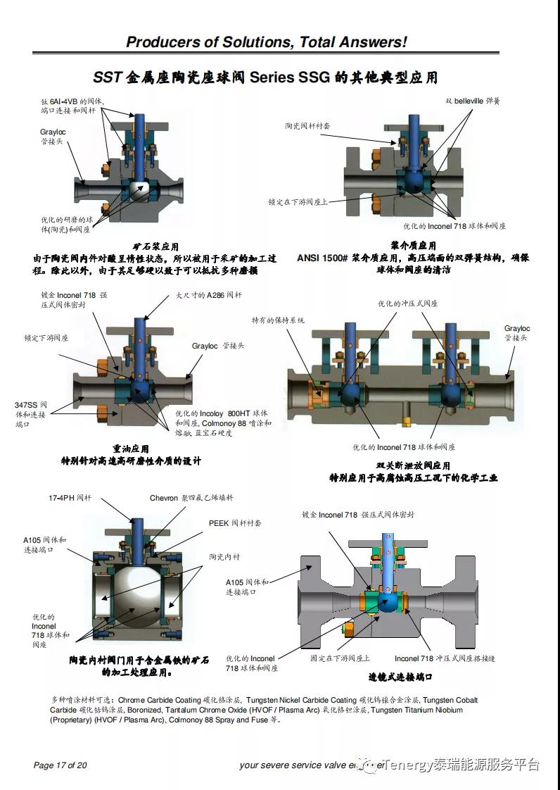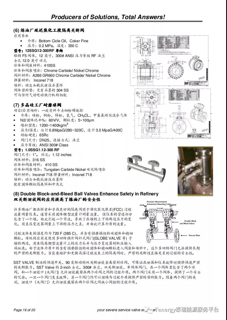 位于美国德州休斯顿的SST公司制造的恶劣工况下的金属座和陶瓷座球阀解决了工业中蒸汽,气体,剧毒气体,石灰浆,煤渣,矿浆,重油等介质的高温高压工况和极端研磨性介质的应用。