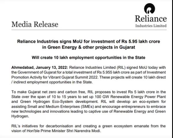 当然“摇钱树”谁都想分一杯羹,在国内聚酯龙头进入新赛道获得丰厚利润的同时,国外石化巨头也坐不住了!当地时间上周四,亚洲首富穆克什·安巴尼控制的信实工业发布公告,宣布与古吉拉特邦政府签订了一项价值近5.95万亿印度卢比(约合810亿美元)的投资协议,其中绝大多数投资将用于建设绿色能源项目,以实现石油化工巨头2035年碳中和的愿景。