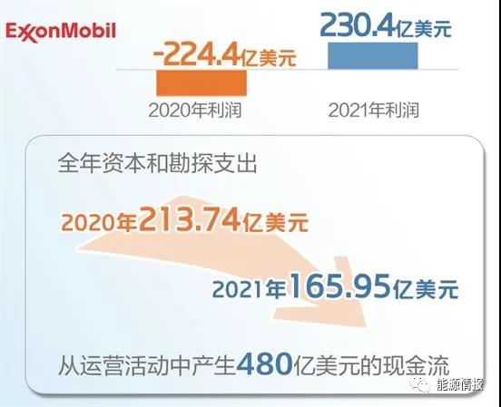 在美国,2021年埃克森美孚盈利230亿美元,完全扭转2020年巨亏224亿美元的局面;从经营活动中产生480亿美元的现金流,为2012年以来最高水平;债务减少200亿美元,恢复到疫情前水平。雪佛龙2021年调整后利润为156亿美元,是2020年的近91倍;营运现金流为292亿美元,同比增长175%;债务减少129亿美元,至314亿美元。