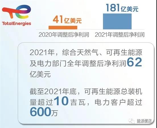 值得注意的是,低碳业务(包括天然气)对国际石油公司业绩的贡献日益凸显,正成为重要增长引擎。2021年四季度,壳牌综合天然气、可再生能源与能源解决方案业务利润增至40.5亿美元,对整体利润贡献率高达63%。道达尔能源可再生能源和电力业务盈利保持增长,2021年调整后税息折旧摊销前利润(EBITDA)录得14亿美元,远高于目标的8亿美元。2021年,bp天然气及低碳能源业务利润同比增长10倍,至75亿美元,占公司利润的34%。
