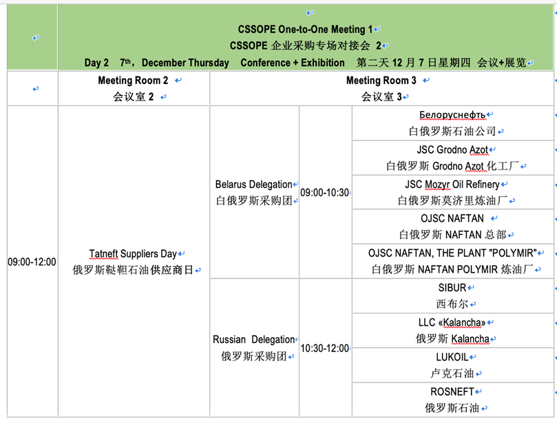为期两天的CSSOPE 2023,将设置国际采购专场、国内采购专场、一带一路采购专场、新能源新材料采购专场、以及国内外多个知名企业的一对一供采对接会。如:三星工程、NMDC GROUP旗下NPCC、埃及 Enppi、 Tatneft 鞑靼石油 、白俄罗斯石油公司 JSC Grodno Azot Khimvolokno 化工厂 、白俄罗斯JSC Mozyr Oil Refinery 莫济里炼油厂 、白俄罗斯OJSC NAFTAN NAFTAN 总部、白俄罗斯NAFTAN POLYMIR炼油厂、乌兹别克团:GTL公司、印度信实、哈萨克团LLP Chemical Solutions公司、印度拉森特博洛有限公司、众一伍德工程、诺瓦基(上海) 能源公司等采购对接专场。