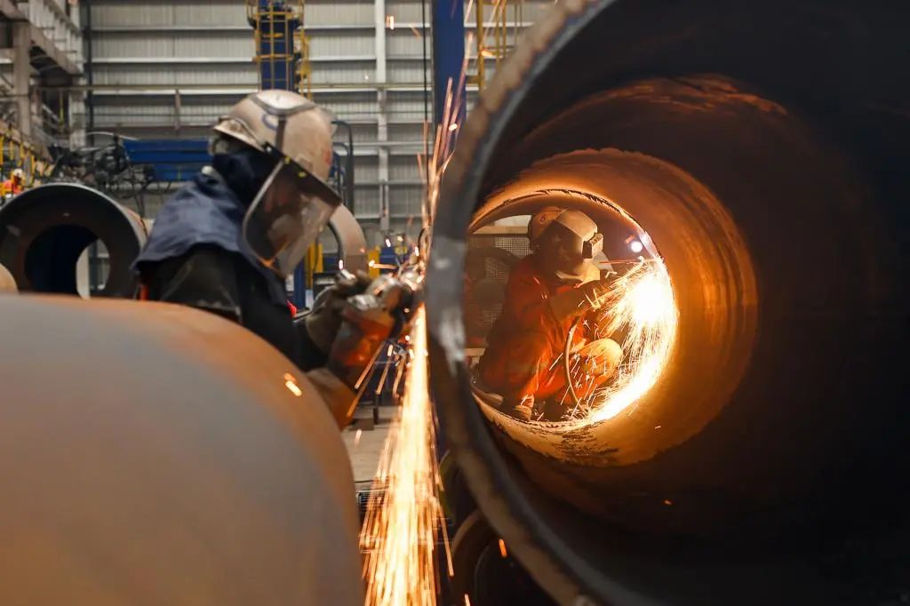 4月10日,工人在建造现场进行钢材切割作业。新华社发
