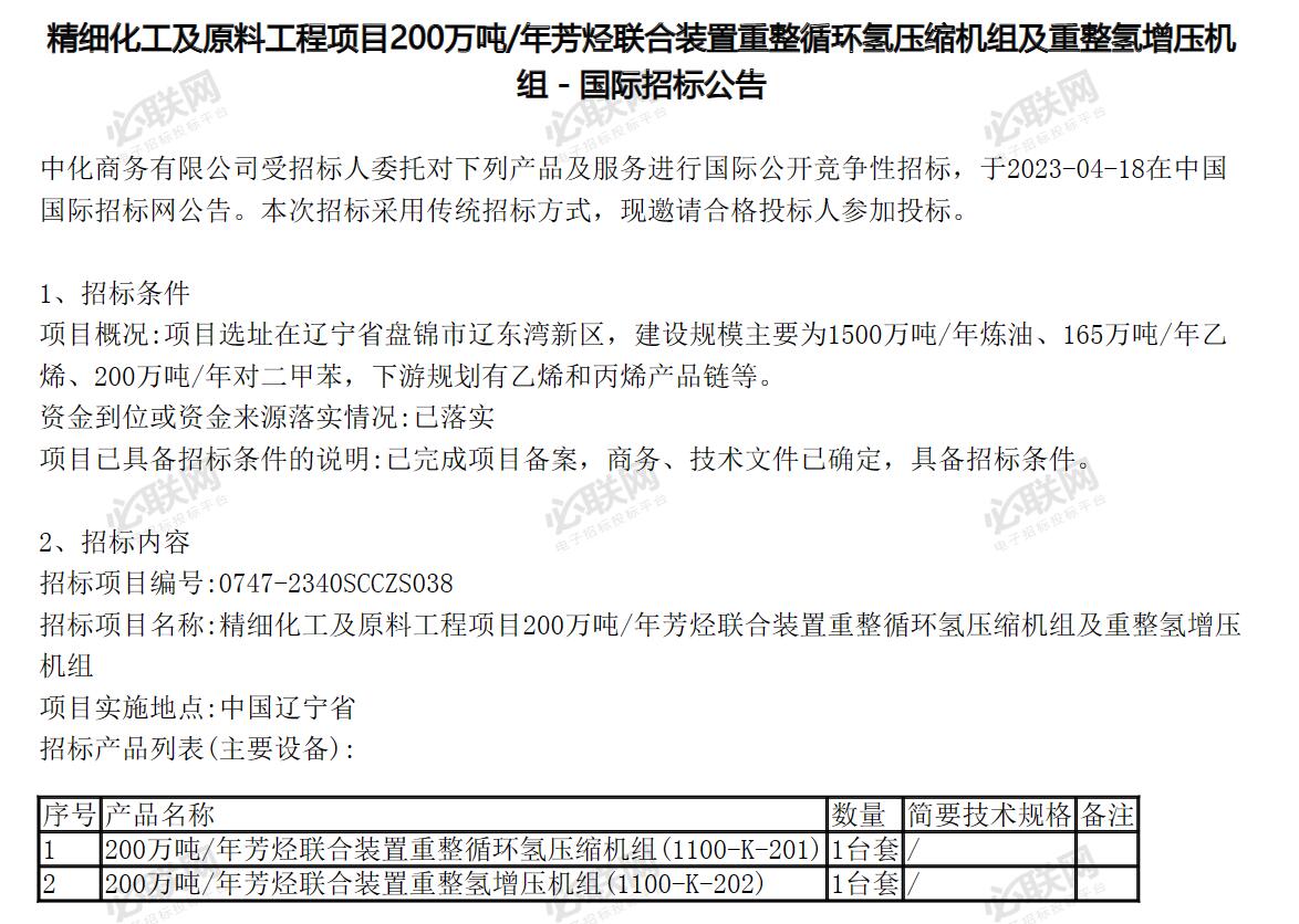 您现在的位置是:首页 > 拟在建项目网站首页拟在建项目 北方华锦联合石化有限公司精细化工及原料工程项目200万吨/年芳烃联合装置重整循环氢压缩机组及重整氢增压机组招标公告 管理员 2023-04-19 TAG: 无标签 上一篇:总投资超5700亿!广西钦州公布2023年重大项目实施方案!包括这些石化项目! 下一篇:东华科技西藏碳酸锂项目首台大型设备吊装完成 相关文章 特别推荐 【火爆出炉】CSSOPE 2025 全球采购对接会排期表 阅读 全球氢能项目大汇总,快来点击索要 阅读 随机推荐 6.5亿美元!Saipem获多个设计及总包合同 中国海油助力乌干达首个油田建设 2022-02-07 17:08:59 ADIPEC 2022|海隆集团全业务亮相2022年阿布扎比国际石油展 2022-11-01 09:12:48 中联重科ZCC3200N石化领域再显神威 2020-12-08 08:38:08 2023年一季度《全球油气海工项目进展更新》正式发布! 2023-04-26 09:07:05 点击排行 关注!孟加拉国Bashundhara集团甲醛项目开工会顺利召开 意大利塞班( SAIPEM)油气项目及采购计划:CSSOPE 为你解读 2019-03-14 15:21:04 集团公司召开2019年HSSE工作视频会议 2019-01-04 18:12:57 石油党员党建信息化平台交纳党费上亿元 2019-01-11 16:33:49 中国石油2022年集中采购招标公告 2022-02-11 20:43:22 标签 会议 中国石化新闻网 中国石油新闻中心 转载 原创 关注我们